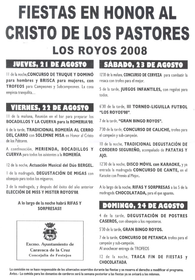 Programa fiesta en honor al Cristo de los Pastores de los Royos