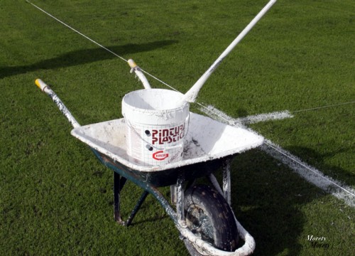 Por otro lado ya se están pintando las líneas del campo para que estén disponibles mañana, esto se lleva a cabo con métodos tradicionales, vamos de los que nunca fallan, a mano.