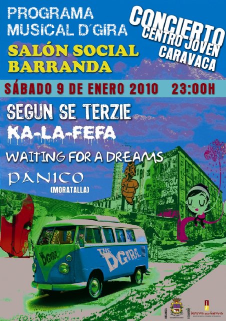 El programa de intercambio de grupos musicales D´Gira continúa el próximo sábado en el Salón Social de Barranda, a partir de las 23.00 horas, con un concierto a cargo de las formaciones caravaqueñas ‘K-La-Fefa’, ‘Según se Terzie’ y ‘Waiting for a Dreams’ y el grupo moratallero ‘Pánico’. Se trata del segundo festival que la Concejalía de Juventud saca del Centro Joven con el fin de acercar la música en directo a los jóvenes residentes en las pedanías.