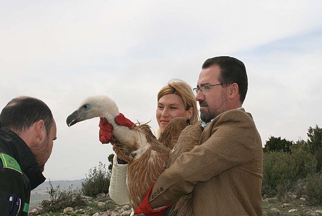El director general de Patrimonio Natural y Biodiversidad, Pablo Fernández, y la concejal de Medio Ambiente del Ayuntamiento de Caravaca, Antonia Mª Álvarez, han liberado hoy dos ejemplares de buitre leonado en el muladar situado en la sierra de Mojantes tras ser tratados en el centro de recuperación de fauna silvestre “El Valle”.