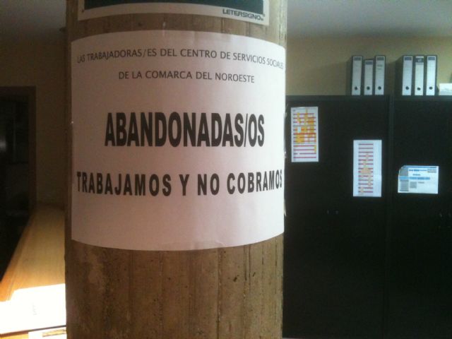 Los trabajadores de la Mancomunidad de Servicios Sociales del Noroeste, una veintena de personas, vienen arrastrando una situación igual o si cabe peor que los de Caravaca Jubilar. A principios del pasado mes de octubre acumulaban tres meses sin cobrar sus nóminas, por lo que el Alcalde Domingo Aranda, actual presidente de turno de la misma, se comprometió con los trabajadores a pagar las nóminas pendientes antes del día 15 del mes pasado, promesa que no ha llegado a cumplir en su mayor parte, pues a día de hoy acumulan dos meses atrasados sin cobrar. Esta situación mantiene la preocupación entre el colectivo de trabajadores hasta tal punto que la han puesto de manifiesto tal y como puede leerse en los carteles que han colocado en las oficinas de la propia sede para conocimiento de las personas que solicitan sus servicios: "LAS TRABAJADORAS/ES DEL CENTRO DE SERVICIOS SOCIALES DEL NOROESTE: ABANDONADAS/OS. TRABAJAMOS Y NO COBRAMOS".