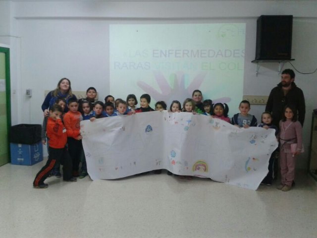 Coincidiendo con la campaña del Día Mundial de las Enfermedades Raras que se celebrará el próximo día 28 de febrero, la Delegación de FEDER en Murcia conjuntamente con los voluntarios de la asociación DGENES han visitado este viernes el Colegio Basilio Sáez de Caravaca de la Cruz para llevar a cabo la campaña de sensibilización sobre estas patologías.