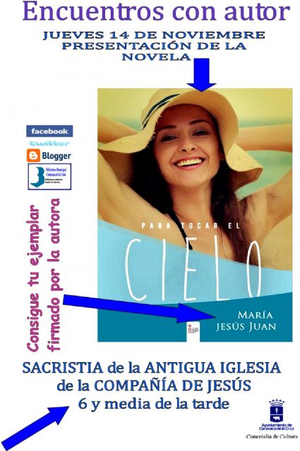 La Concejalía de Cultura del Ayuntamiento de Caravaca, a través de la Biblioteca Municipal, celebra esta tarde un encuentro con la escritora María Jesús Juan, que presentará su novela "Para tocar el cielo". La actividad dará comienzo a las 18.30 horas en la sacristía de la antigua iglesia de la Compañía de Jesús.