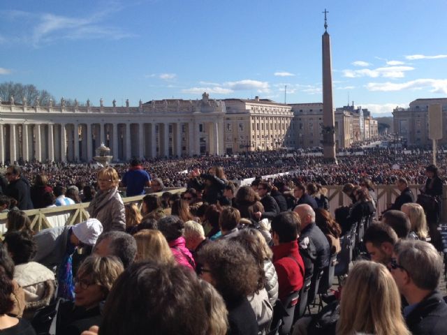 El grupo entero ha participado esta mañana en la Audiencia General que todos los miércoles realiza el Santo Padre en la plaza de San Pedro; durante la cual, el alcalde y el hermano mayor, acompañados por Mons. Lorca Planes, le han hecho entrega al Santo Padre de una réplica en plata de la Santísima y Vera Cruz y de unos paños bordados por las clarisas de Caravaca. Ante este último regalo el Papa Francisco ha asegurado que rezará por ellas y les ha pedido a los caravaqueños que les digan a las clarisas que recen por él.