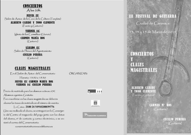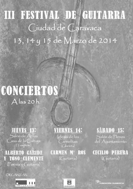 El III Festival de Guitarra de Caravaca de la Cruz, organizado por el Conservatorio con la colaboración del Ayuntamiento y la Fundación Cajamurcia, se celebra los días 13, 14 y 15 de marzo con la participación de destacados músicos a nivel nacional e internacional, que ofrecerán recitales y clases magistrales. Los conciertos previstos darán comienzo a las 20.00 horas y la entrada será gratuita hasta completar aforo.