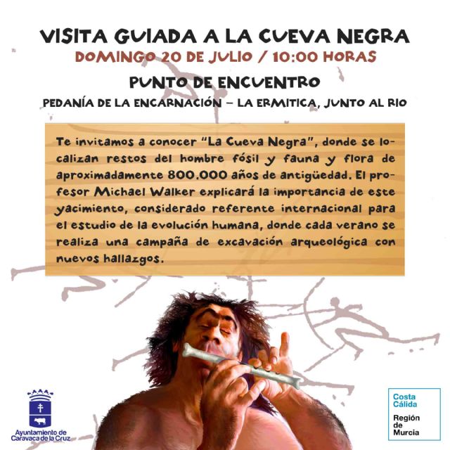 La oferta de actividades turísticas de este fin de semana se completa con la jornada de puertas abiertas al yacimiento de "La Cueva Negra", situado en la pedanía de La Encarnación. La visita se celebrará el domingo, 20 de julio, a las 10.00 horas y tendrá como punto de encuentro "La Ermitica" (junto al rio). El director científico de la XV Campaña de Excavación Arqueológica, el profesor Michel J. Walker, explicará a todos los asistentes la importanca de este yacimiento referente internacional para el estudio de la evolución humana.