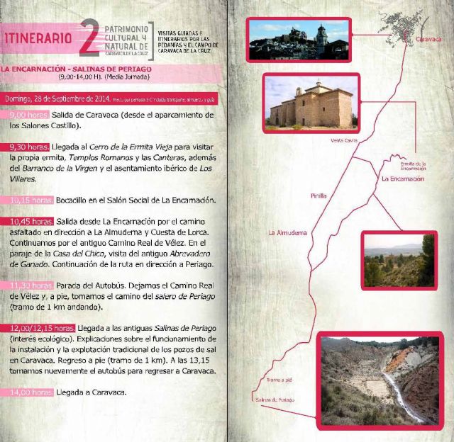 En La Encarnación se visitará el tempo romano y la ermita, el barranco de la Virgen y el poblado ibérico de Los Villares, con almuerzo en la citada pedanía. La ruta continuará por el antiguo Camino Real de Vélez y, en el paraje Casa Chico, se visitará un antiguo abrevadero de ganado.