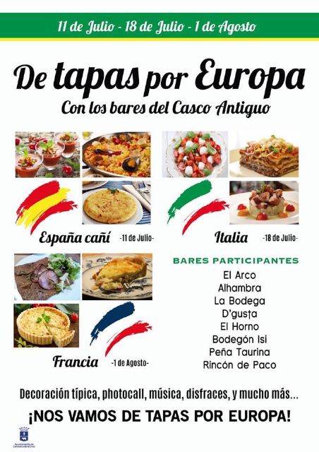 Mañana, sábado 11 de julio, comienza "De tapas por Europa", una iniciativa gastronómica que van a poner en marcha de forma conjunta ocho bares y restaurantes del casco histórico de la ciudad, con la colaboración de la concejalías de Turismo y Comercio del Ayuntamiento de Caravaca de la Cruz.