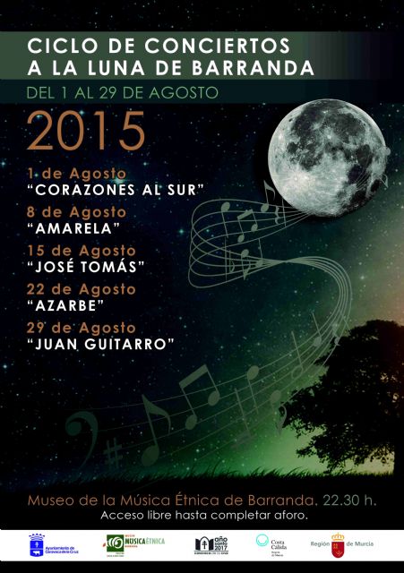 El ciclo "A la luna de Barranda" se prolongará durante todos los sábados del mes agosto con los conciertos de la cantautora murciana Amarela (8 de agosto), el guitarrista flamenco José Tomás (15 de agosto), el grupo de folk "Azarbe" (22 de agosto) y la música tradicional de Juan "Guitarro" (29 de agosto).