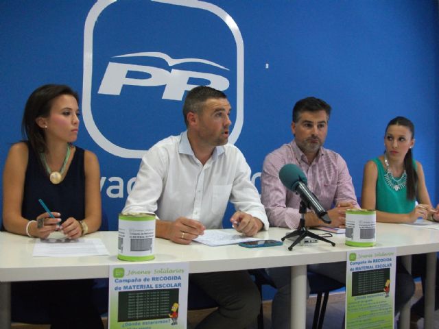 La organización juvenil Nuevas Generaciones del Partido Popular de Caravaca de la Cruz ha presentado la campaña 'Jóvenes Solidarios' consistente en la recogida de material escolar para hacer más fácil el próximo inicio del curso escolar a las familias con menos recursos del municipio. Así lo han expresado tanto el portavoz del Grupo Municipal Popular, José Francisco García, como el concejal Sergio López y Elena Sánchez y Laura Domenech, de NNGG, durante la rueda de prensa ofrecida esta tarde.