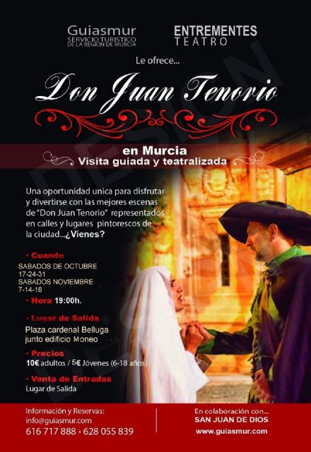 Don Juan Tenorio regresa a las calles de Murcia y Caravaca de la Cruz de la mano de Guiasmur, servicios turísticos de la Región de Murcia, y la compañía teatral Entrementes. Tras el gran éxito de público cosechado en 2013 y 2014, los personajes del clásico de Zorrilla volverán a protagonizar una visita guiada, nocturna y plena de romanticismo.