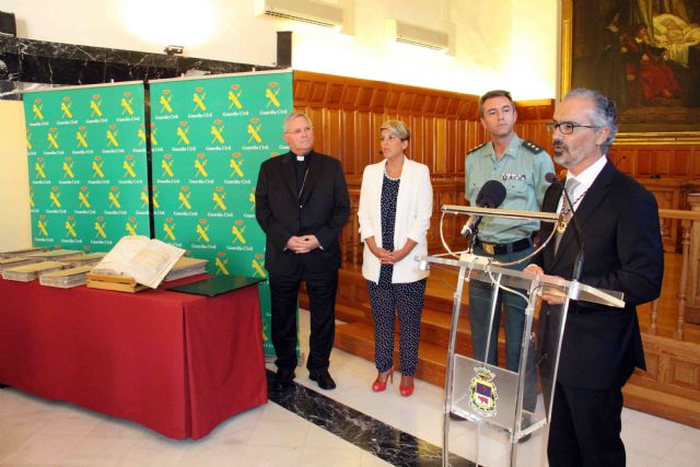 El coronel jefe de la Guardia Civil en Murcia, Jesús Arribas, ha entregado al Ayuntamiento de Caravaca de Cruz, y en su nombre al alcalde, José Moreno, diez tomos de documentación histórica con una cronología que abarca desde el siglo XVI hasta el siglo XX, intervenida en el municipio de Bullas el pasado mes de marzo en el marco de la operación 'LIGNUM', fruto de la cual se recuperaron numerosos documentos y objetos del Patrimonio Histórico Español.
