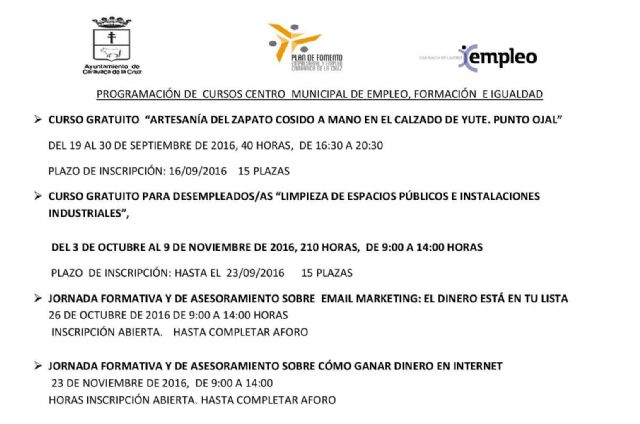 Las solicitudes de inscripción tanto para el curso de 'Limpieza en espacios abiertos e instalaciones industriales' como para las dos jornadas de comercio online se pueden formalizar en el Centro Municipal de Formación, Empleo e Igualdad, situado en la calle Diego Cortés, número 9, junto al jardín de 'El Cejo'. Los interesados también pueden ponerse en contacto con los técnicos responsables de este servicio, a través del correo electrónico 968 701 100 y 630 086 984.
