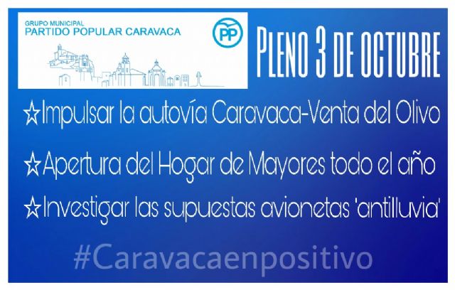 Solicitar al Gobierno regional que impulse la construcción de la autovía Caravaca desde Venta de Cavila-Venta del Olivo y la convierta en proyecto prioritario es el objetivo de una de las tres mociones que el Grupo Municipal Popular lleva al Pleno ordinario del mes de octubre que esta tarde se celebra.