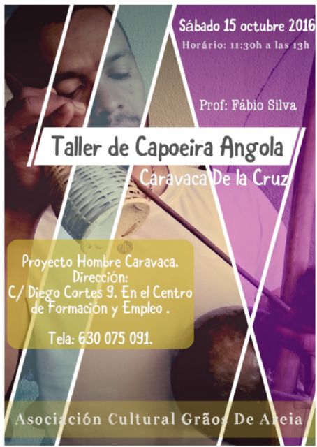 La delegación en Caravaca de la Cruz de la Fundación Proyecto Hombre, con la colaboración con la Concejalía de Servicios Sociales y la Asociación Cultural 'Graos de Areia', celebra un taller gratuito de capoeira el sábado, 15 de octubre, de 11.30 a 13.00 horas.