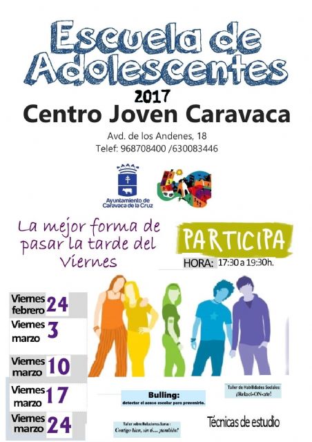La segunda edición de esta actividad comienza con dos sesiones formativas sobre 'Técnicas de estudio y mindfulness', programadas para los viernes 24 de febrero y 3 de marzo. La programación de la 'Escuela de Adolescentes' tendrá continuidad con las charlas 'No al acoso escolar' (10 de marzo), 'Relaciónate. Habilidades sociales' (17 de marzo) y 'Contigo bien, sin ti también. Relaciones sanas' (24 de marzo). Todas las sesiones se llevarán a cabo de 17.30 a 19.30 horas, en las instalaciones del Centro Joven Caravaca.