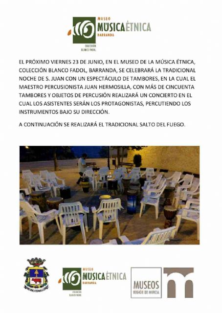 El Museo de la Música Étnica de Barranda-Colección Carlos Blanco Fadol, con el apoyo de las concejalías de Cultura y Turismo del Ayuntamiento de Caravaca de la Cruz, celebra este viernes, 23 de junio, a partir de las 22.00 horas, la 'Noche de San Juan'. Para ello, los asistentes podrán participar en el tradicional "Salto del Fuego", acompañados del sonido de la percusión.