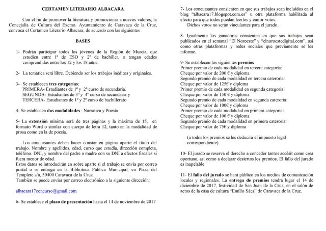 Con el fin de promover el gusto por la Literatura y promocionar nuevos valores en este campo, la Concejalía de Cultura del Ayuntamiento de Caravaca de la Cruz convoca el Certamen Literario Juvenil 'Albacara', que en esta edición adquiere carácter regional.