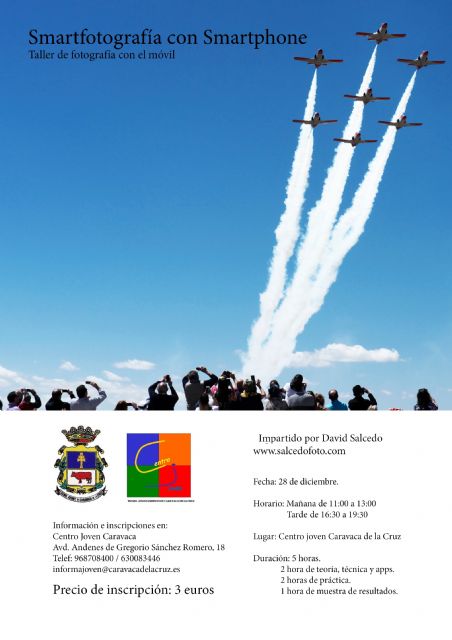 Por otro lado, continuando con los talleres de fotografía que se realizan en el Centro Joven, el próximo 28 de diciembre se impartirá el curso 'Smartfotografía', cuyo objetivo es aprender técnicas para hacer buenas fotografías con los Smartphone y dispositivos móviles. El taller estará impartido por el fotógrafo David Salcedo y tendrá una duración de cinco horas (2 horas de teoría, técnica y aplicaciones móviles, 2 horas de práctica y una hora de muestra de resultados). El precio de la inscripción es de tres euros.