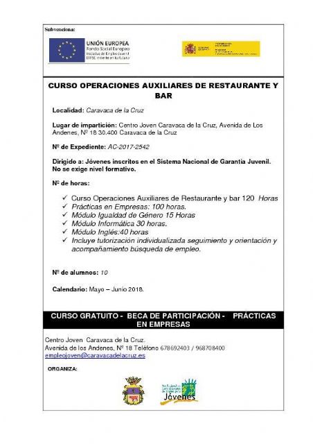 El Ayuntamiento de Caravaca de la Cruz abre el plazo de solicitud de matrícula en los cursos 'Promoción turística local e información al visitante' y 'Operaciones auxiliares de restaurante y bar', acciones formativas incluidas en el programa de empleo juvenil 'Actívate', que va destinado a jóvenes menores de 30 años, beneficiarios el Sistema Nacional de Garantía Juvenil.