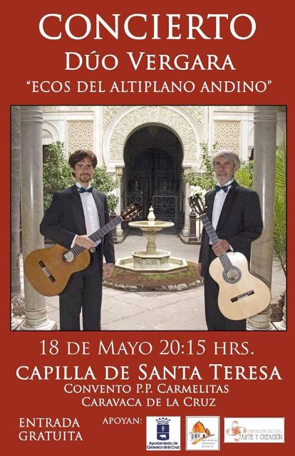 El Dúo Vergara, de Santiago de Chile -compuesto por los guitarristas Ramón Vergara Leiva y Ramón Vergara S., concertistas en guitarra clásica- ofrece un concierto centrado en la música inspirada en el Altiplano de los Andes, donde el charango, un instrumento resultado de fusión de dos culturas muy distintas, es protagonista en obras como 'El cóndor pasa'. El concierto, organizado con la colaboración de la Concejalía de Cultura del Ayuntamiento de Caravaca de a Cruz y de los Padres Carmelitas Descalzos, tendrá lugar en la capilla de Santa Teresa de dicho convento, este viernes, 18 de mayo, a las 20.15 horas. La entrada es de acceso libre.