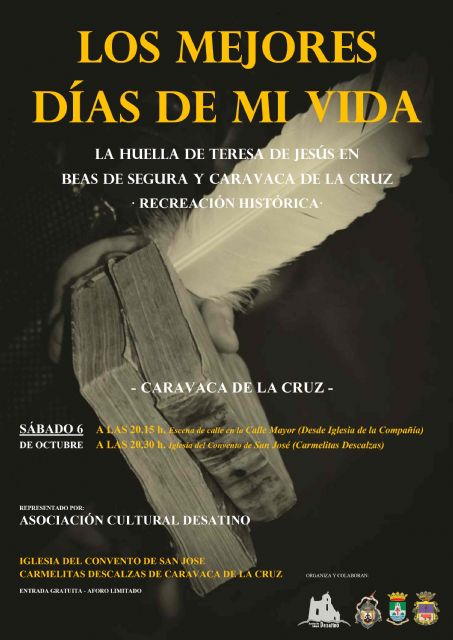 La recreación histórica 'Los Mejores años de mi vida. Huella de Teresa de Jesús en Beas de Segura y Caravaca de la Cruz' arrancará, con una primera escena, a las 20.15 horas, en la puerta de la sala de exposiciones de la Compañía de Jesús, para continuar a las 20.30 horas en el interior de la iglesia de San José del antiguo convento de las Madres Carmelitas. El acceso será gratuito hasta completar aforo.