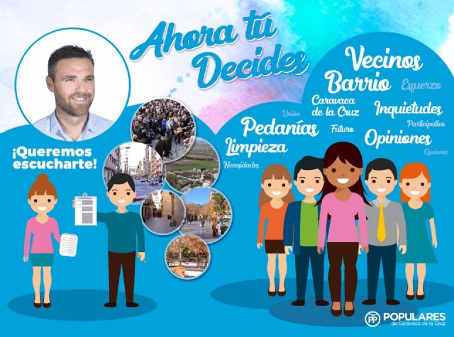 El Partido Popular de Caravaca inicia mañana, sábado 12 de enero, una campaña de participación ciudadana que, bajo el nombre 'Ahora tú decides', recorrerá todos los rincones del municipio recabando la opinión de los vecinos para elaborar el programa con el que concurrirá a las elecciones del próximo 26 de mayo.
