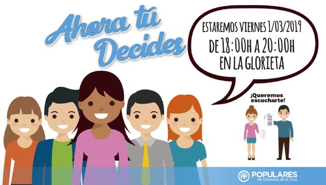 El paseo de La Glorieta será este viernes 1 de marzo el nuevo destino de la campaña de participación ciudadana 'Ahora tú decides' del Partido Popular de Caravaca. De 18:00 a 20:00 horas, aproximadamente, los vecinos podrán acercarse al stand, charlar con el candidato a la Alcaldía, José Francisco García, y el resto del equipo y expresar su opinión y trasladar sus propuestas.