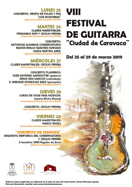 Del lunes 25 al viernes 29 de marzo se celebra la VIII edición del Festival de Guitarra 'Ciudad de Caravaca', que organiza el Conservatorio Profesional de Música 'Leandro Martínez Romero' y el Ayuntamiento de Caravaca de la Cruz.