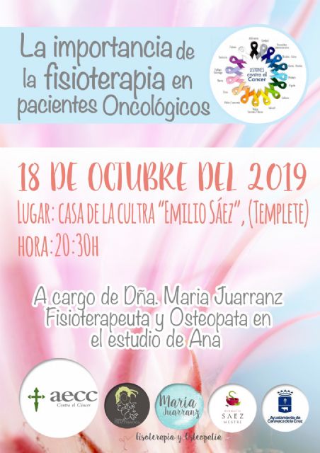 La junta local de la Asociación Española Contra el Cáncer (AECC) en Caravaca ha organizado la charla 'La importancia de la fisioterapia en pacientes oncológicos', que tendrá lugar este viernes, 18 de octubre, a las 20:30 horas en el salón de actos de la Casa de la Cultura Emilio Sáez.