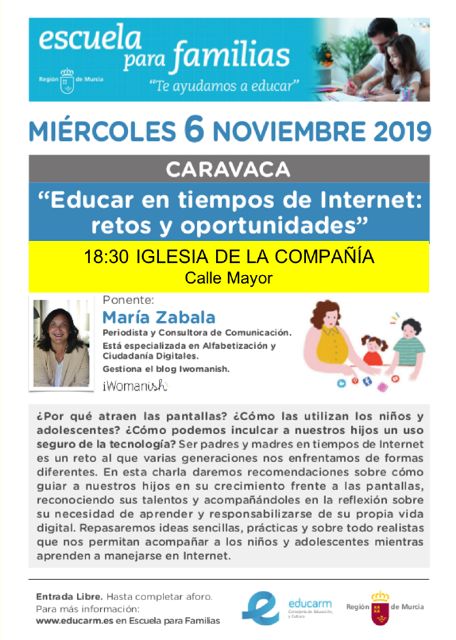 La Escuela de Familias comienza este miércoles en Caravaca con la conferencia 'Educar en tiempos de Internet: retos y oportunidades'
