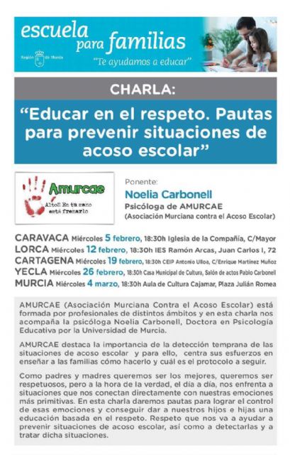 0. La sacristía de la antigua iglesia de la Compañía de Jesús acoge mañana, miércoles 5 de febrero, a las 18.30 horas, la conferencia 'Educar en el respeto. Pautas para prevenir situaciones de acoso escolar', a cargo de la psicóloga de la Asociación Murciana contra el Acoso Escolar (Amurcae), Noelia Carbonell. Esta charla forma parte de la 'Escuelas para Familias', promovida por la Consejería de Educación y Cultura del Gobierno Regional, con la que este año colabora el Ayuntamiento de Caravaca de la Cruz.