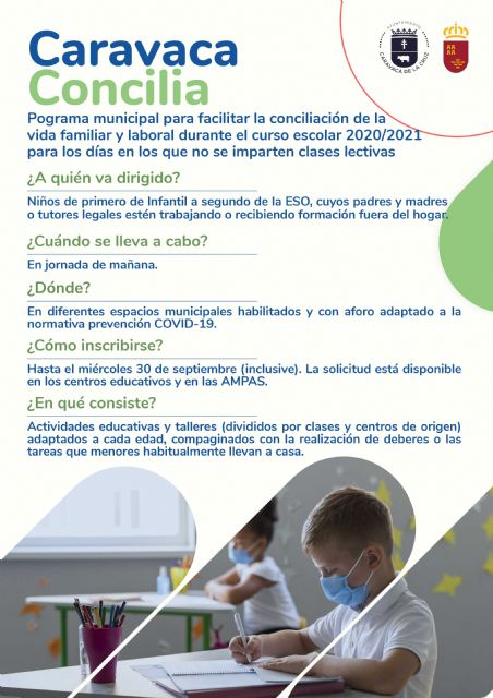 El Ayuntamiento de Caravaca de la Cruz prepara el programa 'Caravaca Concilia', dirigido a alumnado de centros educativos que tienen una reducción de días lectivos, dentro de las medidas de prevención del Covid-19 dictadas por las autoridades competentes en educación, y cuyos padres o tutores trabajan fuera del domicilio en horario escolar.