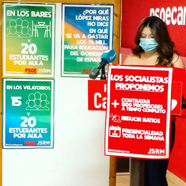 Ante la negativa del Gobierno Regional de tomar medidas contundentes para frenar la pandemia en las aulas y gestionar, Juventudes Socialistas, junto al Partido Socialista, exigen a López Miras que: se contraten 1500 docentes a tiempo completo, se desdoble aulas y se garantice el "aislamiento" de los grupos de alumnos y se permita a los alumnos ir a clase los 5 días lectivos de la semana.