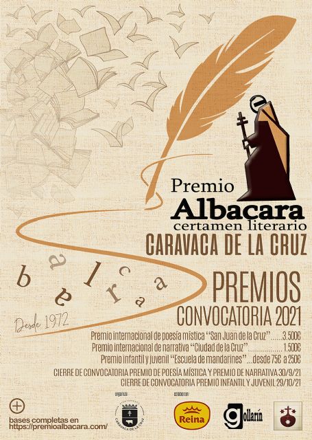 El Ayuntamiento de Caravaca de la Cruz, a través de su Concejalía de Cultura, anuncia la convocatoria del certamen literario Premios Albacara 2021, en sus tres líneas de participación: ‘Premio Escuela de Mandarines', 'Premio de Narrativa Ciudad de la Cruz' y 'Premio de Poesía Mística San Juan de la Cruz', las dos últimas modalidades con carácter internacional.