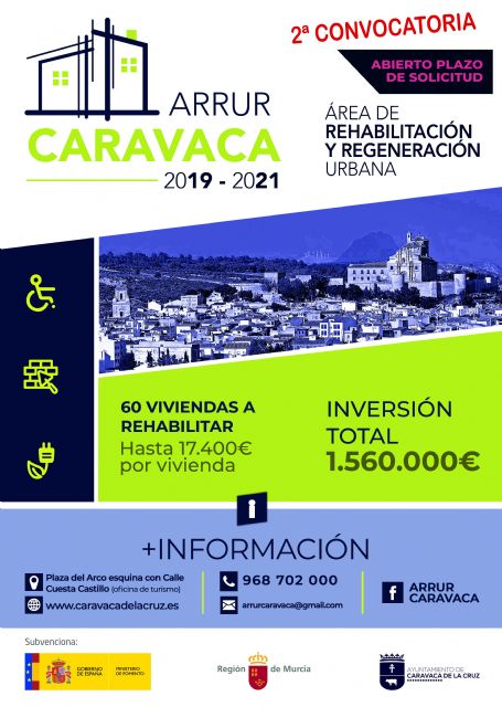18/08/2021. Hasta el 30 de septiembre permanece abierta la segunda convocatoria para optar a las subvenciones recogidas en el Plan de Rehabilitación de Viviendas del Casco Histórico de Caravaca de la Cruz, dotada con 278.000 euros. La concejal de Urbanismo, Mónica Sánchez, ha informado que los propietarios de inmuebles repartidos a lo largo de 79 calles podrán beneficiarse de estas ayudas de hasta de 17.400 euros, una vez que la Comunidad Autónoma, a través de su Dirección General del Vivienda, ha dado luz verde al proceso.