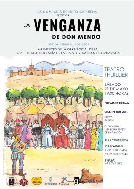 13/05/2022. La Concejalía de Cultura del Ayuntamiento de Caravaca de la Cruz vuelve a subir el telón del Thuillier con una de las obras más sobresalientes y representadas de la historia del teatro español. 'La venganza de don Mendo' se representa el sábado 21 de mayo, a las 19:30 horas, de la mano de más de veinte actores y actrices de la Compañía Bendito Cariñena, que darán vida al texto de Pedro Muñoz Seca, estrenado en el teatro de la Comedia de Madrid en 1918.