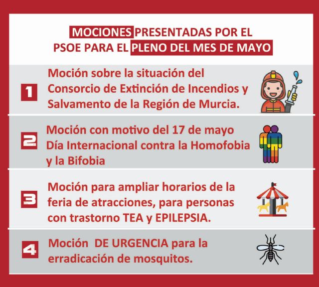 En esta moción, el PSOE pedirá que se lleven a cabo distintas medidas ya que actualmente el Consorcio de Extinción de Incendios Y Salvamento de la Región de Murcia (CEIS) se encuentra en una muy mala situación; tanto en lo que se refiere a medios humanos, como también en lo referente a medios materiales.