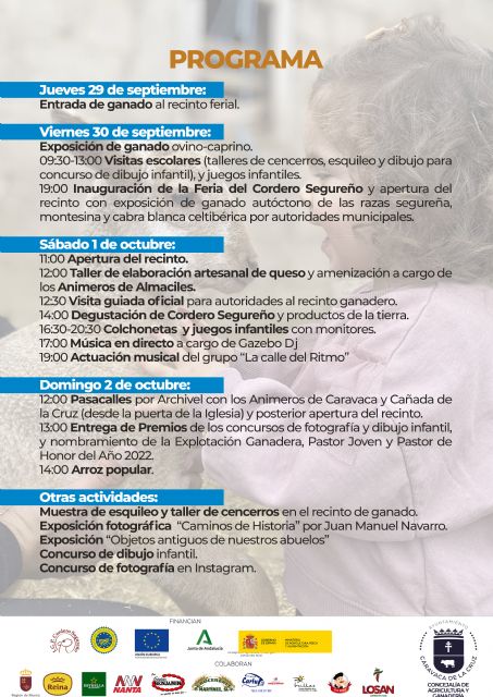 El domingo, 2 de octubre, la Feria del Ovino Segureño y la Ganadería Extensiva se iniciará con un pasacalles por Archivel con los animeros de Caravaca de la Cruz y Cañada de la Cruz. Posteriormente, se entregarán tanto como premios de los certámenes de dibujo y fotografía como los reconocimientos de la 'Explotación ganadera', 'Pastor Joven' y 'Pastor Honorífico' del año 2022.