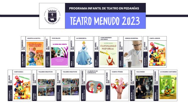 La programación se prolongará hasta el mes de diciembre con las siguientes citas: 'Tote Pelote' (26 de febrero, a las 18.00 horas, en La Almudema), 'La Cenicienta' (18 de marzo, a las 18.00 horas, en Pinilla), 'Confundiendo historias' (15 de abril, a las 18.00 horas, en Navares), 'Ciencia divertida' (13 de mayo, a las 18.00 horas, en Caneja), 'Canta Juegos' (17 de junio, a las 17.00 horas, en Los Prados), 'Cata Baila' (29 de julio, a las 18.00 horas, en El Moralejo), Taller Creativo (5 de agosto, a las 19.00 horas, en El Moral), Taller Creativo (12 de agosto, a las 19.00 horas, en Los Royos), 'La abuelita caperucita' (16 de septiembre, a las 19.00 horas, en Archivel), 'Cuenta Títeres' (21 de octubre, a las 18.00 horas, en Singla), 'Halloween' (25 de noviembre, a las 18.00 horas, en Benablón) y, por último 'La cigarra cantarina' (23 de diciembre, a las 18.00 horas, en Barranda).