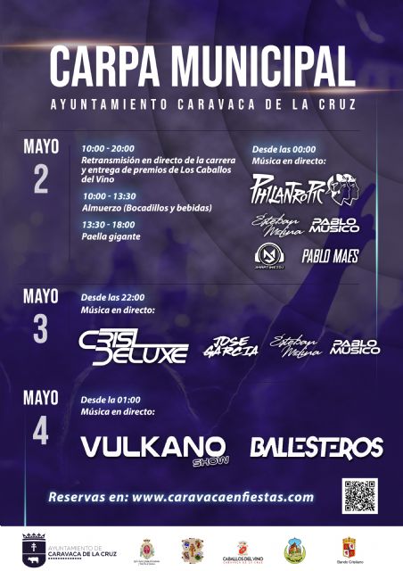 La programación de la Carpa Municipal arrancará el 2 de mayo por la mañana. Durante el día, la oferta comprende el arroz popular, al precio de 7,50 euros, o un paquete que incluye el almuerzo (bocadillo + bebida), asiento en tribuna para el pasacalles de los Caballos del Vino, arroz popular y seguimiento en pantalla del concurso de carrera por el precio de 20 euros. Las reservas y pago se efectuará online a través de la web Caravaca en Fiestas, a partir de la próxima semana.
