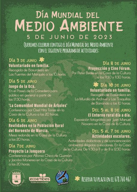 El programa del 'Día Mundial del Medio Ambiente' comenzará el sábado, 3 de junio, con acción de voluntariado en familia dentro del Proyecto Basuraleza, que tendrá lugar a las 10.00 horas en el entorno de la Fuentes del Marqués. Esta misma actividad se repetirá el sábado, 10 de junio, en los parajes de Las Tosquillas de Barranda y La Muralla de Archivel. Para participar tanto en la programada en el casco urbano como en las dos pedanías citadas, se necesario inscribirse previamente a través del número de teléfono 968 76 04 67.