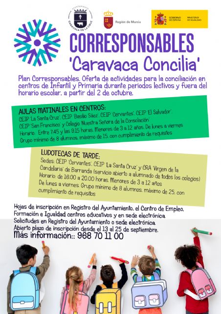 El plazo de inscripción en las actividades del programa 'Caravaca Concilia' permanecerá abierto del 13 al 25 de septiembre. Los impresos de solicitud están disponibles en los centros escolares, el Registro Ayuntamiento, el Centro del Empleo, Formación e Igualdad o el tablón de anuncios de la sede electrónica. Las solicitudes deberán formalizarse de forma presencial en el Registro del Ayuntamiento o de manera telemática a través de la sede electrónica.