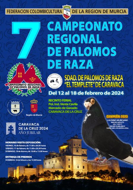 08/02/2024. Caravaca de la Cruz será del 12 al 18 de febrero la sede del séptimo Campeonato Regional de Palomos de Raza. Este evento, que congregará a más de 300 aficionados esta práctica deportiva, ha sido presentado por el concejal de Deportes en el Consistorio caravaqueño, Pepe Fernández Tudela; el presidente de la Federación Colombicultura de la Región de Murcia, José Rubio, y el presidente de la Sociedad de Palomos de Raza 'El Templete' de Caravaca, Juan Puertas.