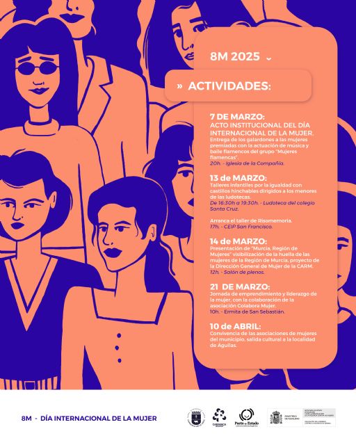 Las siguientes actividades que se plantean son los talleres infantiles por la igualdad dirigidos a los menores que participan en las ludotecas del Programa 'Caravaca Concilia' (13 de marzo), el taller de 'Risomemoria' (13 de marzo), la presentación de proyecto 'Murcia, Región de Mujeres' (14 de marzo), la jornada de emprendimiento y liderazgo con la implicación de la Asociación 'Colabora Mujer' y, para finalizar, una jornada de convivencia con las asociaciones de mujeres del municipio con una salida cultural al municipio de Águilas (10 de abril). Para más información, consultar programación.