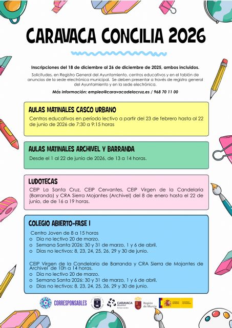 18/12/2025. El Ayuntamiento de Caravaca de la Cruz pone en marcha el Plan 'Caravaca Concilia' para el año 2026, una iniciativa consolidada estos últimos años que ofrece servicios de apoyo a las familias para facilitar la conciliación de la vida laboral y familiar, garantizando al mismo tiempo la atención, seguridad y desarrollo educativo y social de los menores.
